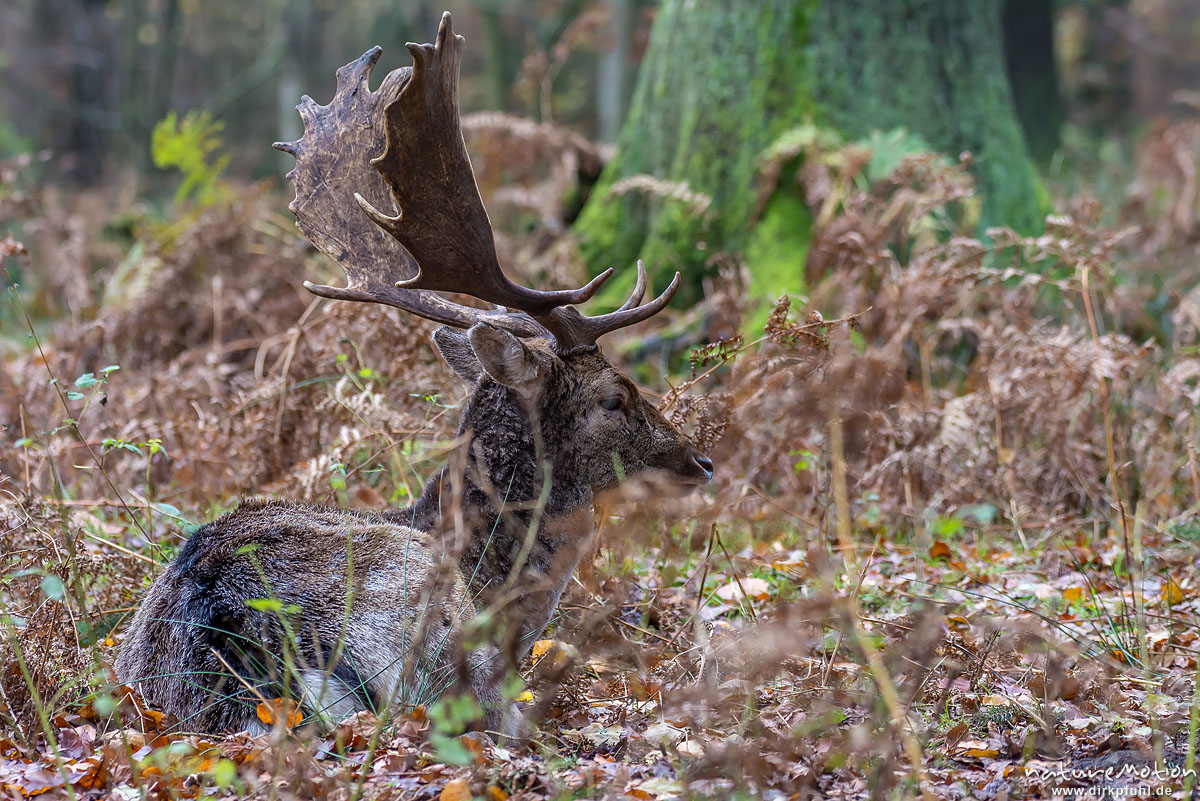 Damhirsch, Dama dama, Cervidae, Hirsch mit vollem Geweih, rastendes Tier, Wildpark Neuhaus, Neuhaus, Deutschland