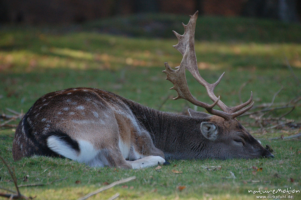 Damhirsch, Dama dama, Cervidae, Männchen, liegend, Rast, Vogelkoje Amrum Amrum, Deutschland