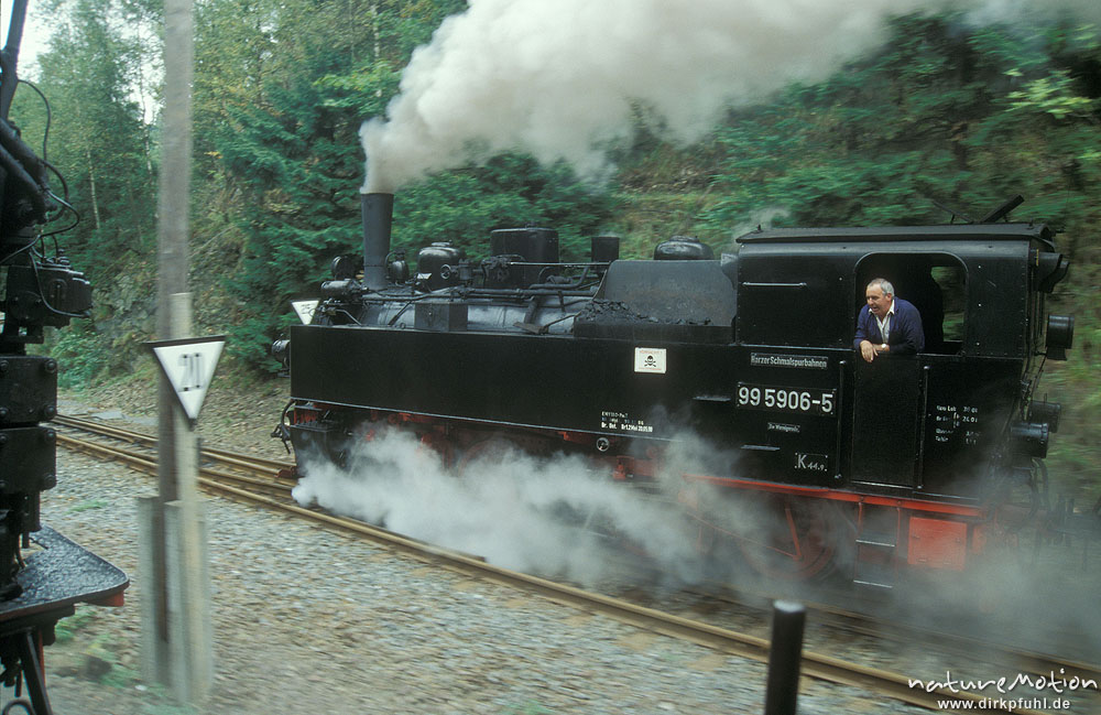 Dampflok der Harzer Schmalspurbahn in voller Fahrt, bahnhof von Schierke, Harz, Deutschland