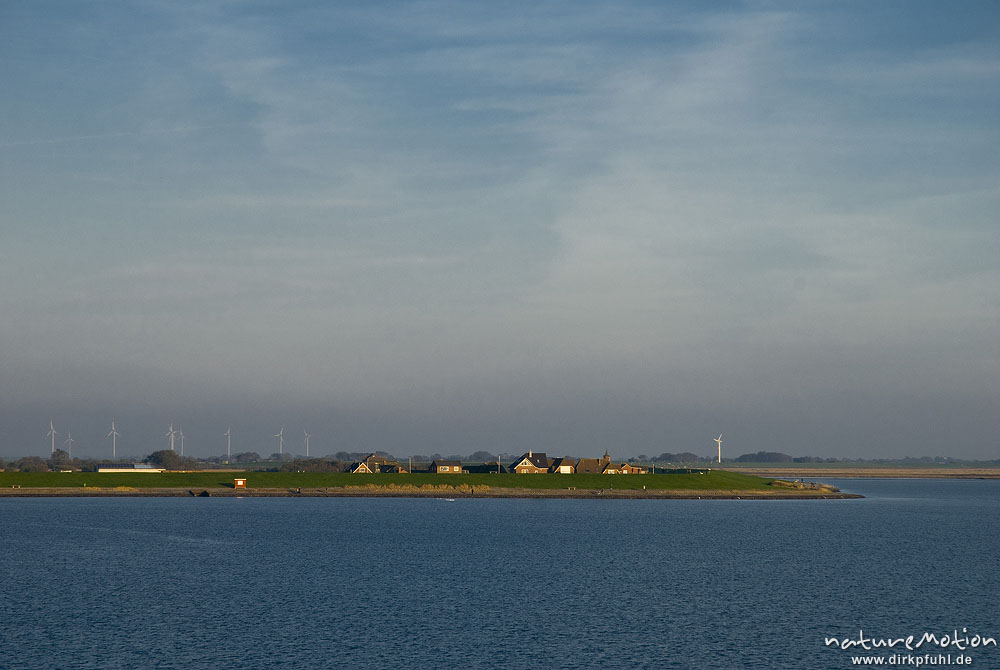 Deich, Häuser und Windräder, Fähranleger Dagebüll, Dagebüll, Deutschland