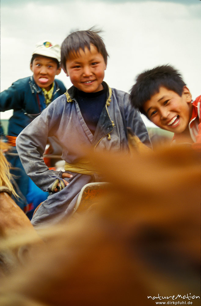 drei freche Jungen nach Pferderennen auf Pferd ,