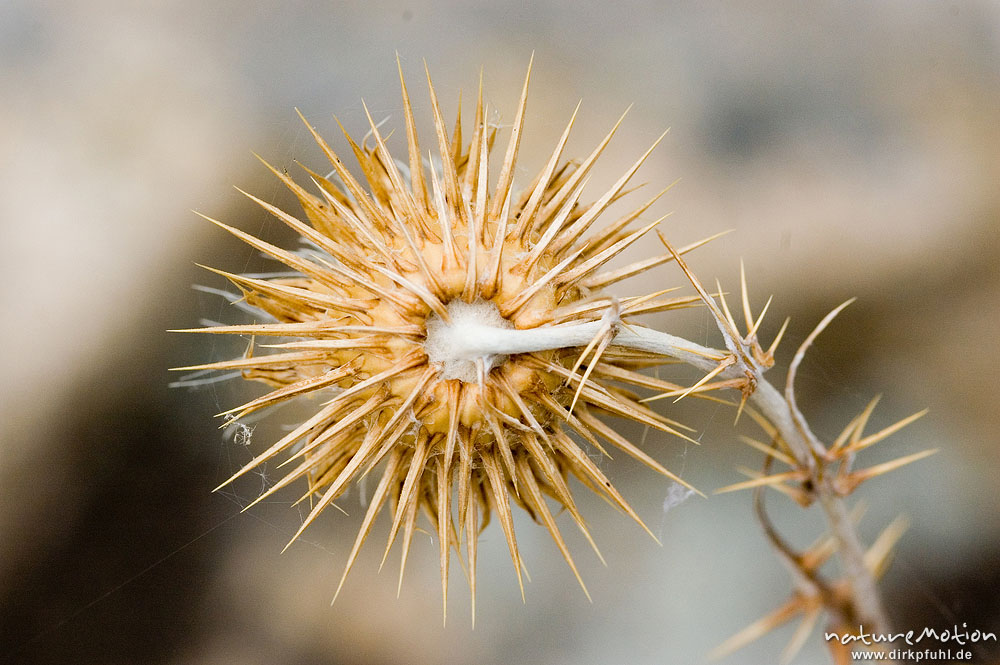 Eberwurz, Carlina spec., Korbblütler (Asteraceae), Blütenstand unterseits, Felsküste bei Ille Rousse Korsika, Frankreich