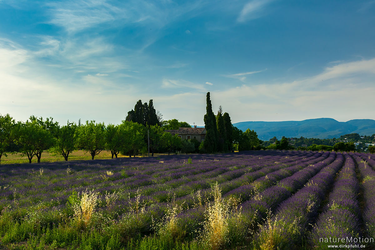Echter Lavendel, Lavandula angustifolia, Lippenblütler (Lamiaceae), Lavendelfeld im Abendlicht, Apt - Provence, Frankreich
