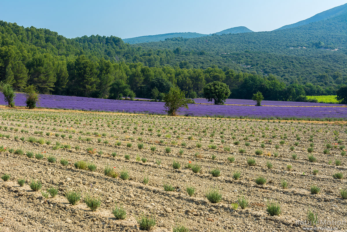 Echter Lavendel, Lavandula angustifolia, Lippenblütler (Lamiaceae), Lavendelfeld mit frisch gesetzten und noch nicht blühenden Pflanzen, dahinter blühendes Feld, Rustrel - Provence, Frankreich