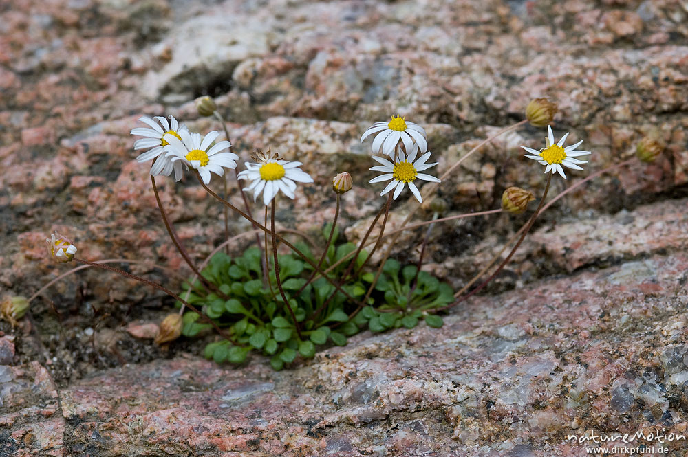 Echtes Zwerggänseblümchen, Spatelgänseblümchen, Bellium bellidioides, Korbblütler (Asteraceae), auf Felsen am Bachufer, Tal des Cavo, Korsika, Frankreich
