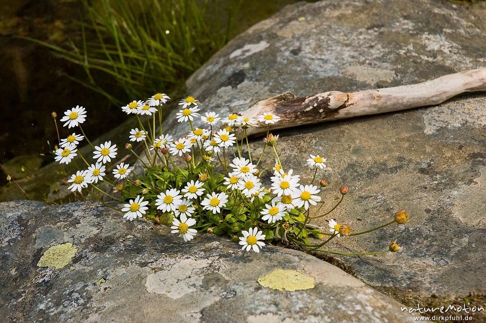 Echtes Zwerggänseblümchen, Spatelgänseblümchen, Bellium bellidioides, Korbblütler (Asteraceae), Horst in Felsspalte, Manganello-Tal, Korsika, Frankreich