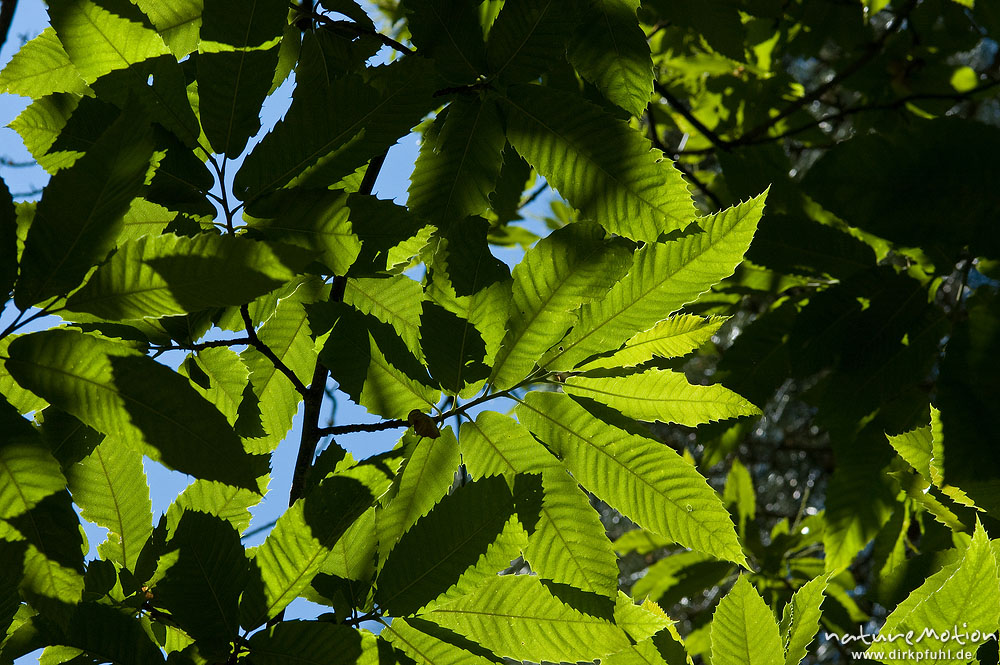 Edelkastanie, Esskastanie, Castanea sativa, Fagaceae, Blätter im Gegenlicht, Manganello-Tal Korsika, Frankreich