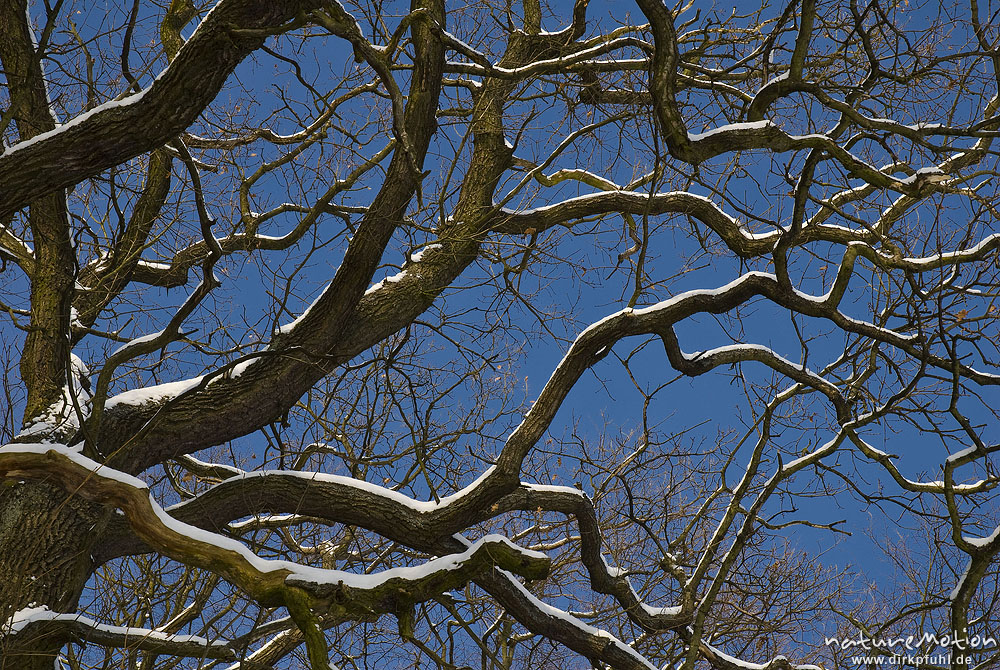 Eiche, schneebedeckte Äste vor blauem Himmel, Westerberg, Göttinger Wald, Göttingen, Deutschland