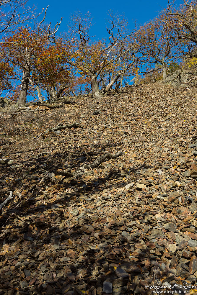 Eichen inmitten Schutthalde an steiler Bergflanke, Bodetal, Harz, Deutschland