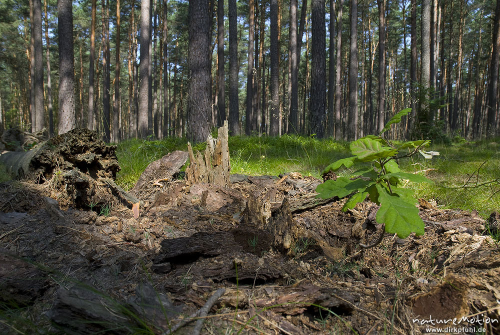 Eichenschössling wächst aus den Überresten einer umgestürzten Kiefer, dahinter ehemalige Kiefernmonokultur im heutigen Nationalpark Müritz, Krienke, Deutschland