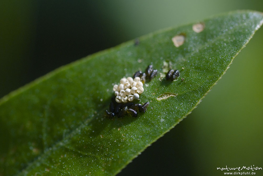 Eier, Eigelege von Insekten auf Blatt, frisch geschlüpfte Larven, Uferzone Quellteich Kerstlingeröder Feld, Göttingen, Deutschland
