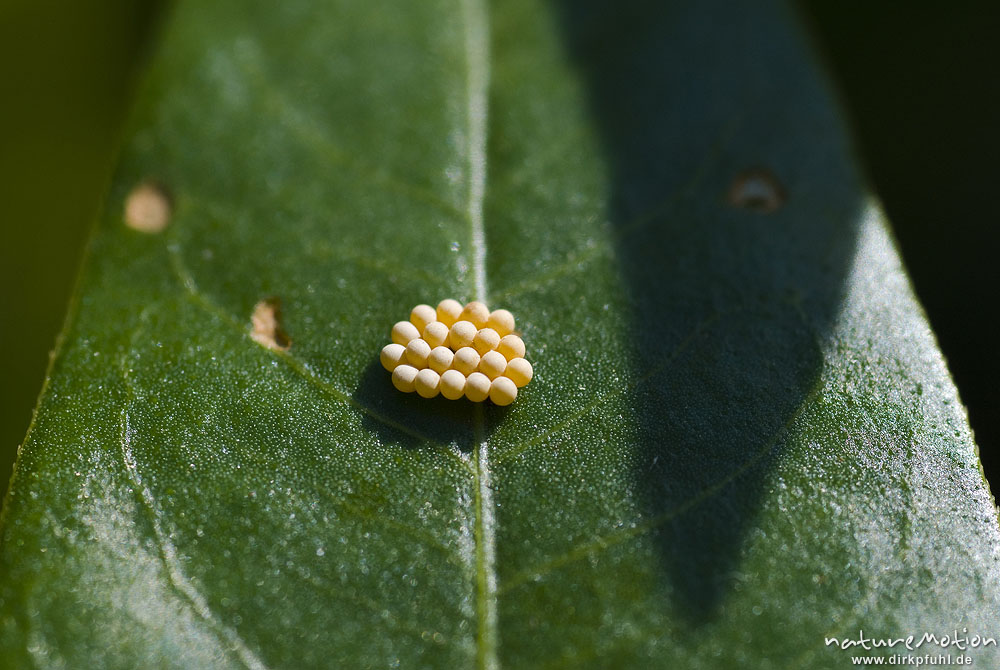 Eier, Eigelege von Insekten auf Blatt, Uferzone Quellteich Kerstlingeröder Feld Göttingen, Deutschland