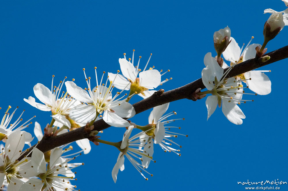Eingriffeliger Weißdorn, Crataegus monogyna, Rosaceae, Zweig mit Blüten und Dornen vor blauem Himmel, Göttingen, Deutschland