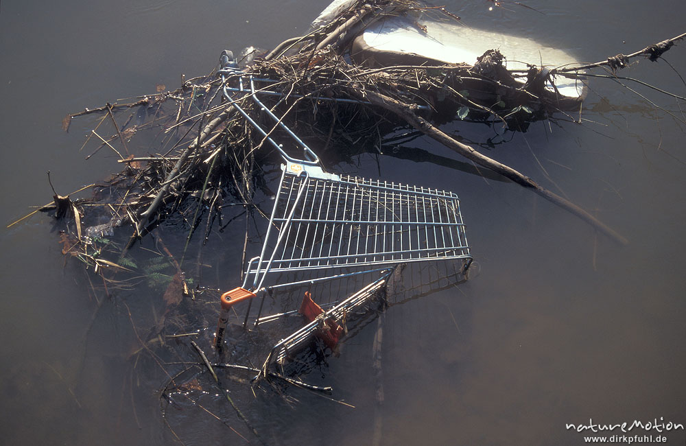 Einkaufswagen, in Fluss geworfen, Treibholz, Leinekanal, Göttingen, Deutschland