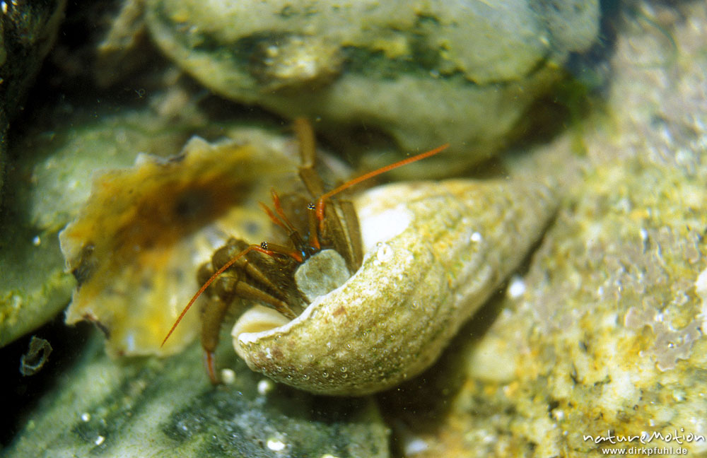 Einsiedlerkrebs, Pagurus prideaux, Paguridae, Einsiedlerkrebs in Schneckengehäuse, Bretagne, Frankreich