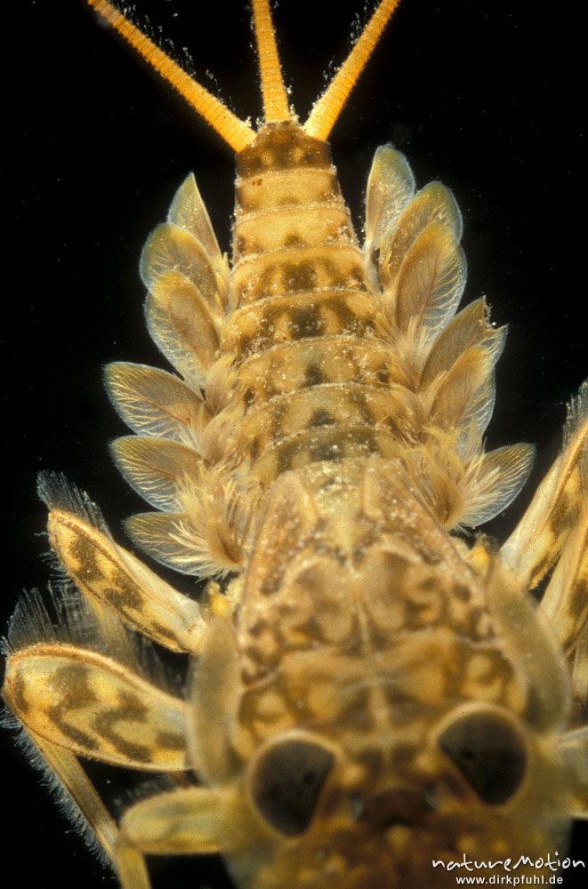 Eintagsfliege, Ecdyonurus spec., Ephemeroptera, Larve, Detail Abdomen und Kiemen, Niemetal, Deutschland