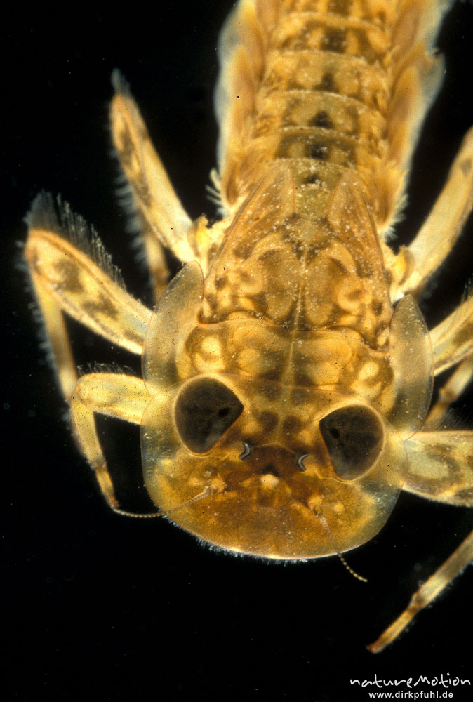 Eintagsfliege, Ecdyonurus spec., Ephemeroptera, Larve, Detail Kopf und Thorax Niemetal, Deutschland
