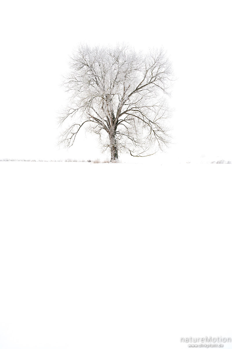 einzeln stehender Baum in weißer Winterlandschaft, Göttingen, Deutschland