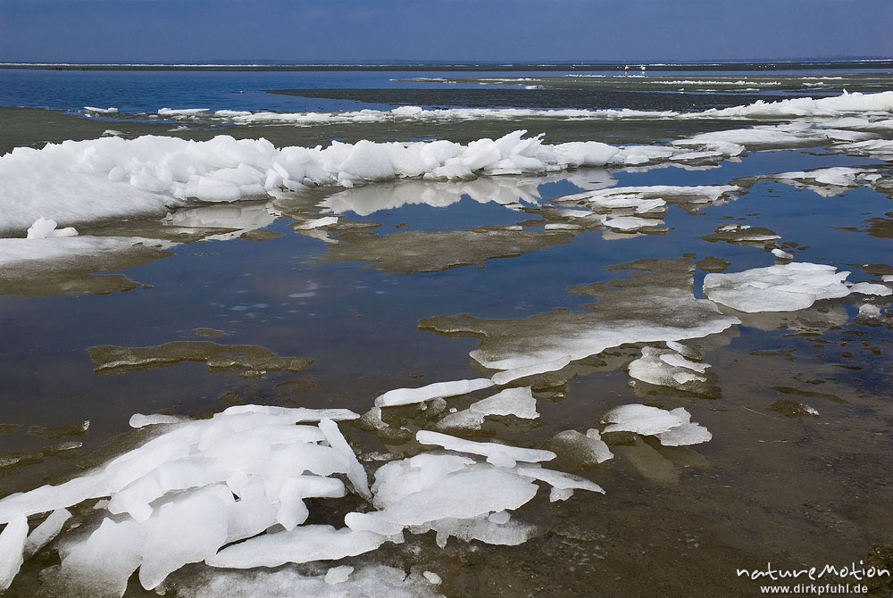 Eisschollen am Ufer des Barther Bodden, Wasser teilweise noch mit Eisflächen und Vereisung, Groß Mohrdorf, Deutschland