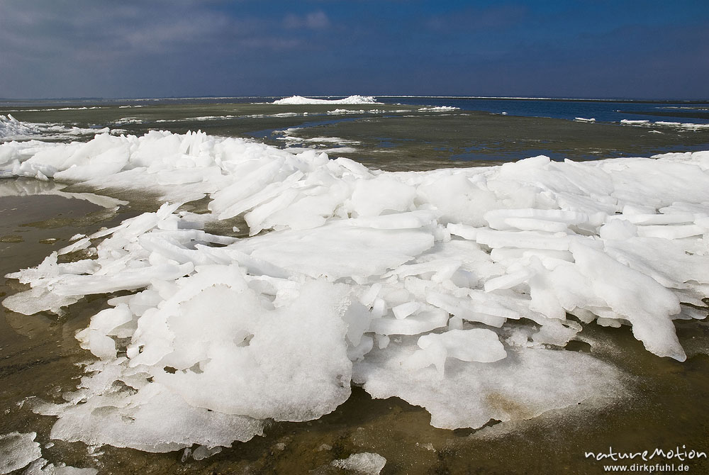 Eisschollen am Ufer des Barther Bodden, Wasser teilweise noch mit Eisflächen und Vereisung, Groß Mohrdorf, Deutschland