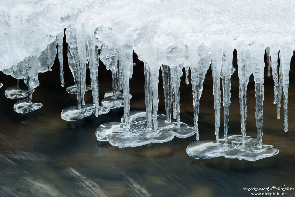 Eiszapfen an vereistem Bachufer, von der Eisdecke herabtropfendes Wasser bildet regelrechte Tropfste, Löwenhagen, Deutschland