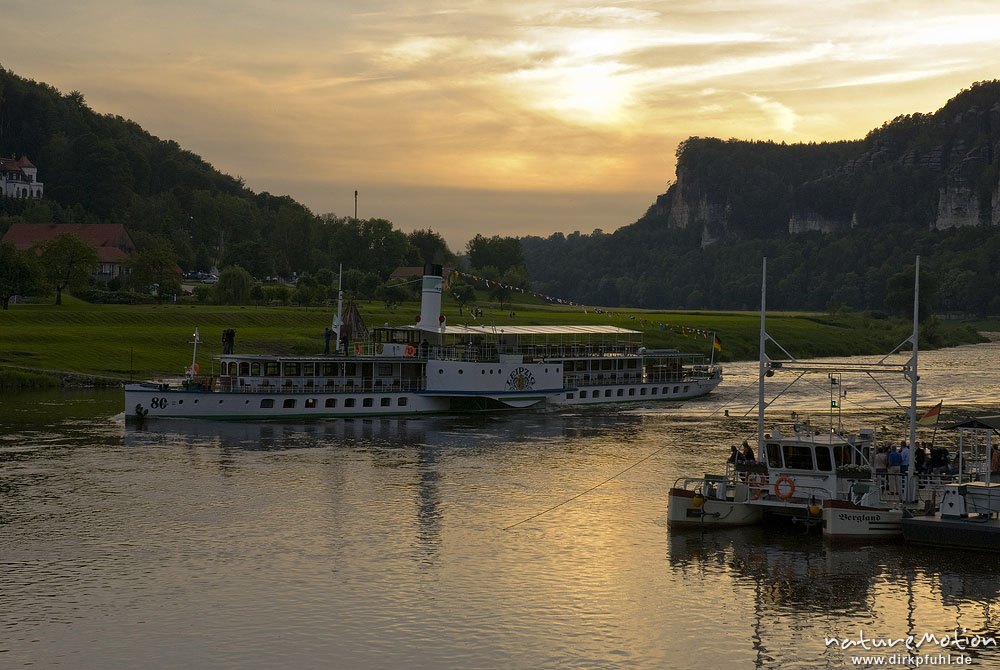 Elbe, Fähranleger bei Rathen, Raddampfer "Leipzig" der "Weissen Flotte" Rathen, Deutschland
