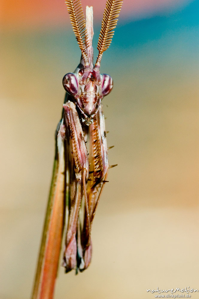 Empusa Fangschrecke, Empusa pennata, Männchen, Empusidae, Kopf und Thorax, gefächerte Fühler, Campin, Korsika, Frankreich
