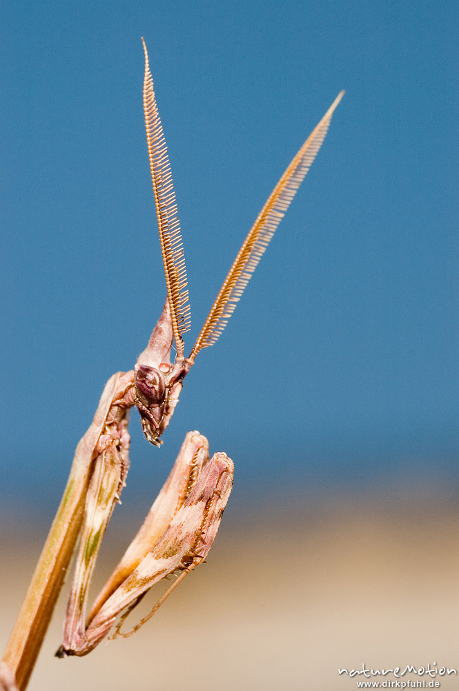 Empusa Fangschrecke, Empusa pennata, Männchen, Empusidae, Kopf und Thorax, gefächerte Fühler, Campingplatz Plage d'Arone, Korsika, Frankreich