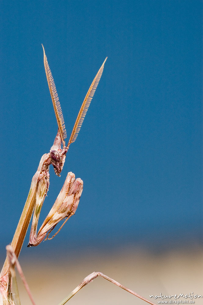 Empusa Fangschrecke, Empusa pennata, Männchen, Empusidae, Kopf und Thorax, gefächerte Fühler, Campin, Korsika, Frankreich