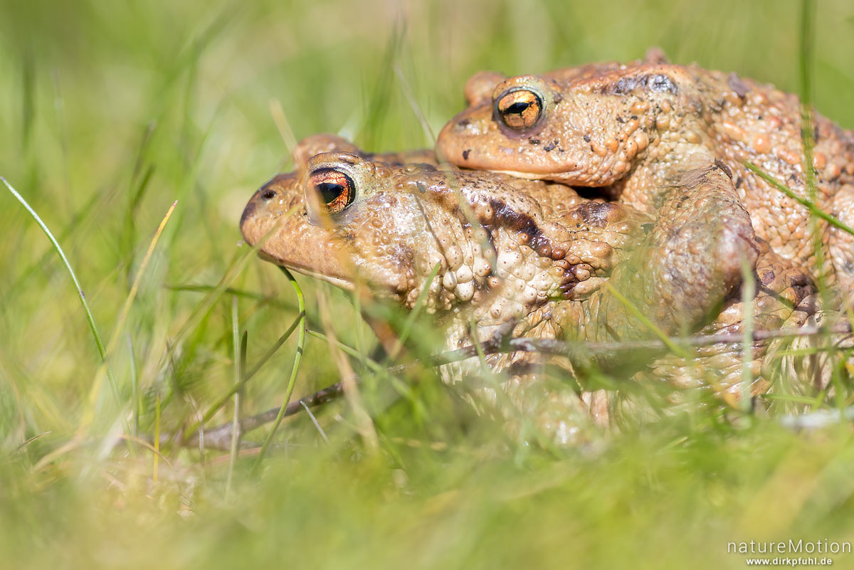 Erdkröte, Bufo bufo, Bufonidae, Paar auf Wanderung zum Laichgewässer, Ossenfeld, Dransfeld, Deutschland
