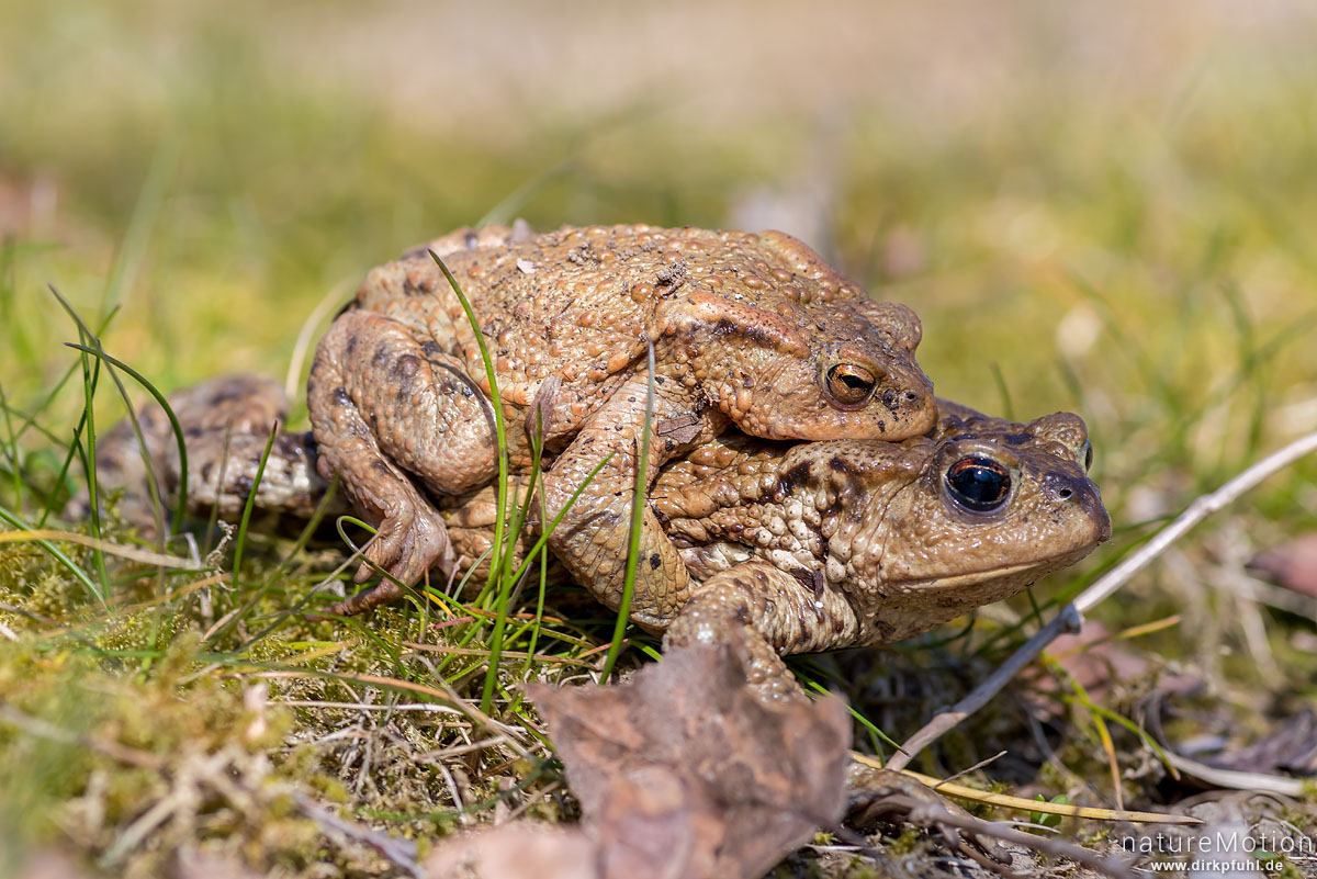 Erdkröte, Bufo bufo, Bufonidae, Paar auf Wanderung zum Laichgewässer, Ossenfeld, Dransfeld, Deutschland