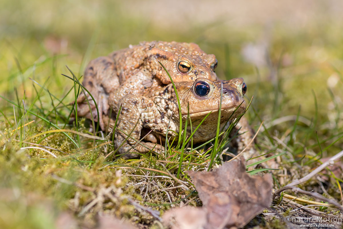 Erdkröte, Bufo bufo, Bufonidae, Paar auf Wanderung zum Laichgewässer, Ossenfeld, Dransfeld, Deutschland