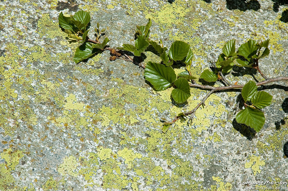 Erle, kriechender Zweig auf flechtenbedecktem Fels, Restonica-Tal Korsika, Frankreich