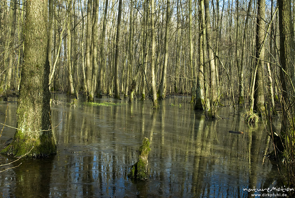 Erlenbruch im Winter, Reste von Eisdecke, Herberhäuser Stieg, Göttingen, Deutschland