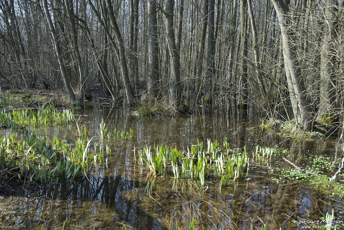 Erlenbruch mit stehendem Wasser, Sprösslinge von Wasserlilien, darin Grasfrosch, Rana temporaria, Herberhäuser Stieg, Göttingen, Deutschland