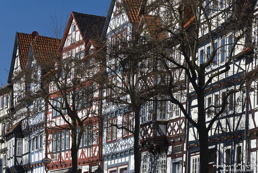 Fachwerkhäuser, Hausfassaden mit bunt bemaltem Fachwerk, davor noch unbelaubte Bäume, Innenstadt von Allendorf, Bad Sooden-Allendorf, Deutschland