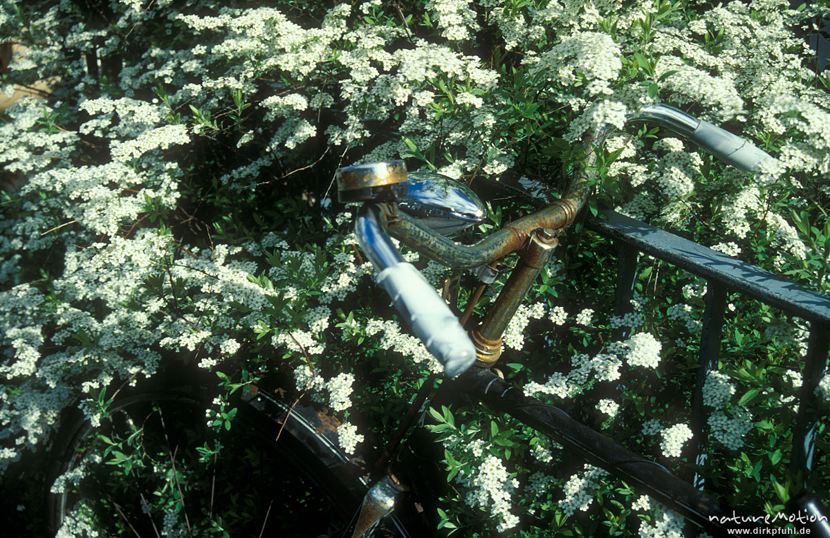 Fahrrad steht an blühender Hecke, Bremen, Deutschland