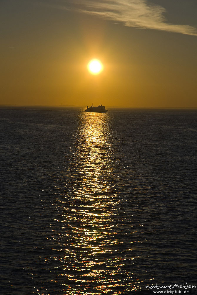 Fahrrinne mit Markierung durch Tonnen und Zweige, Fähre, untergehende Sonne, Fährlinie Dagebüll Amrum, Dagebüll, Deutschland
