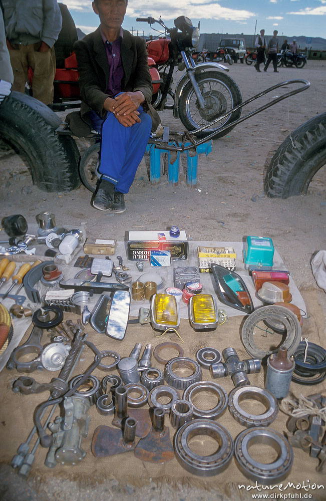 Fahrzeug-Ersatzteile, auf dem Boden ausgebreitet und zum Verkauf angeboten, dahinter sitzt der Verkäufer, Markt von Chowd, Chowd, Mongolei