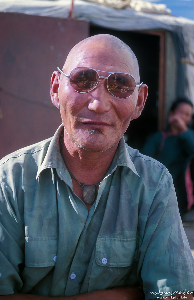 Familienoberhaupt, Mann mit Sonnenbrille vor seiner Jurte, Mongol Els, Mongolei