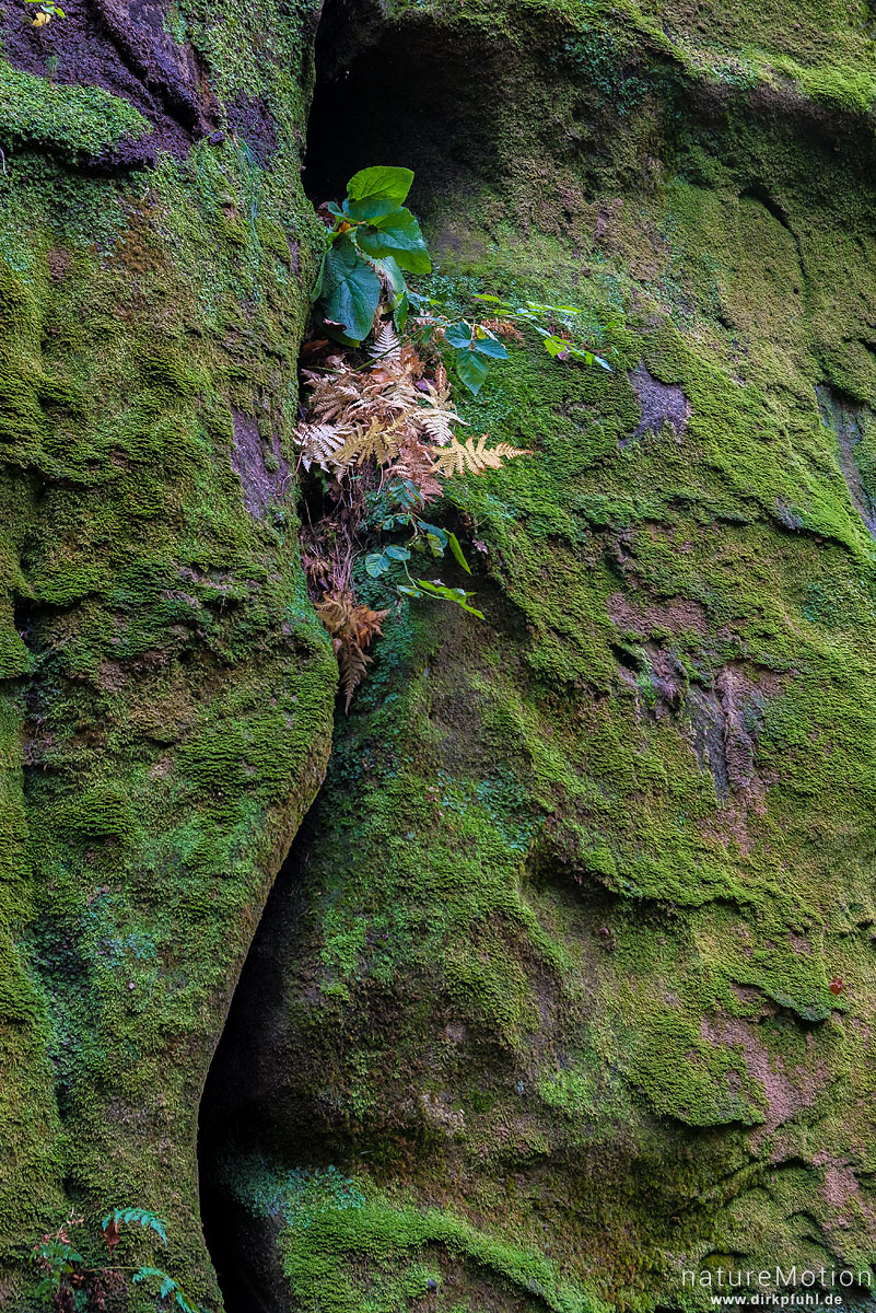 Farnpflanze in Felsspalte, moosbedeckter Sandstein, Bad Schandau, Deutschland