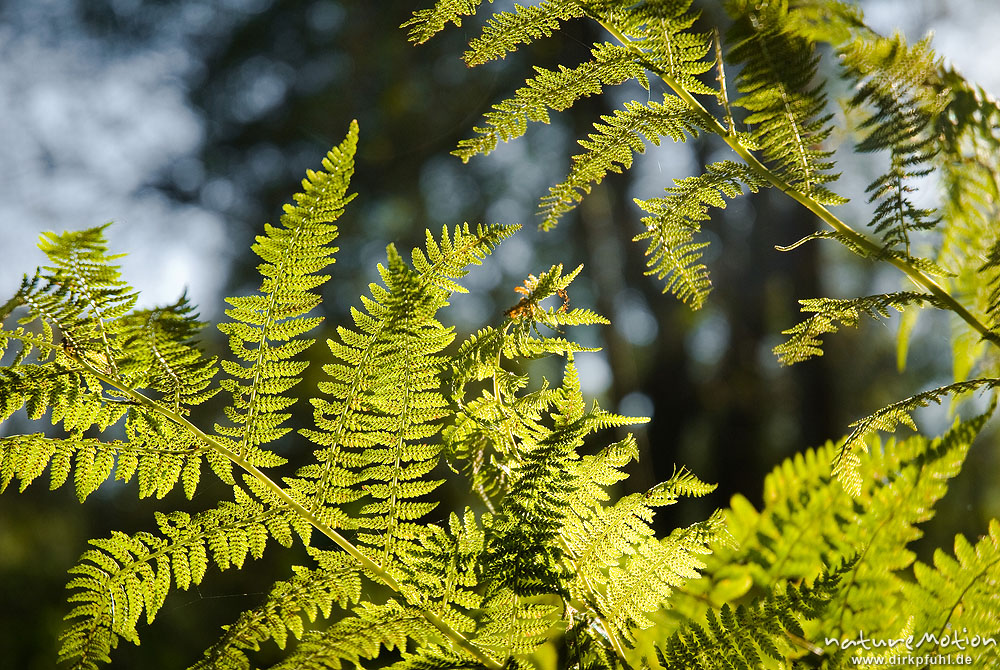 Farnwedel, im Hintergrund Lichtreflexe auf Wasseroberfläche, Sporangien, Tal und Ufer der Holzape nahe Wülmersen, Trendelburg, Deutschland