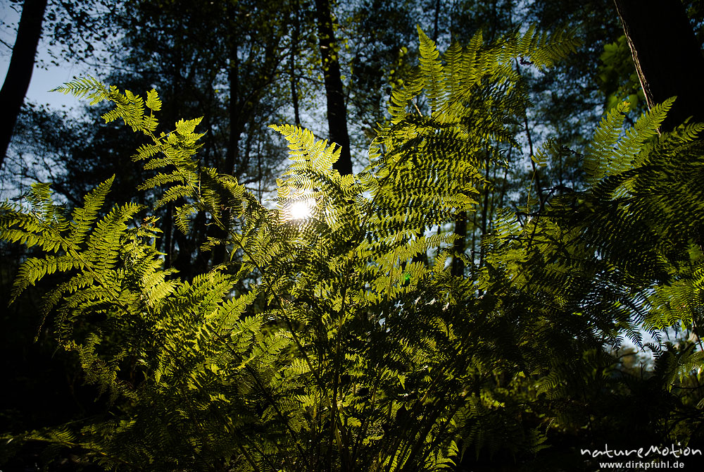 Farnwedel, von unten gegen das Licht, Sporangien, Tal und Ufer der Holzape nahe Wülmersen, Trendelburg, Deutschland