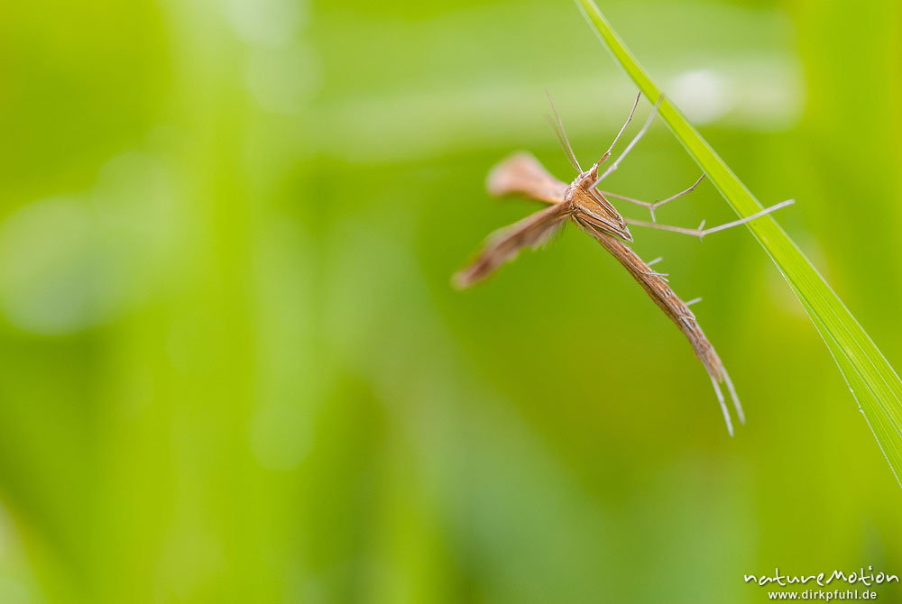 Federmotte (Familie), Emmelina monodactyla, Federmotten (Pterophoridae), Tier seitlich, an Grashalm, Grenzstreifen der ehemaligen deutsch-deutschen Grenze, A nature document - not arranged nor manipulated, Hitzelrode, Deutschland