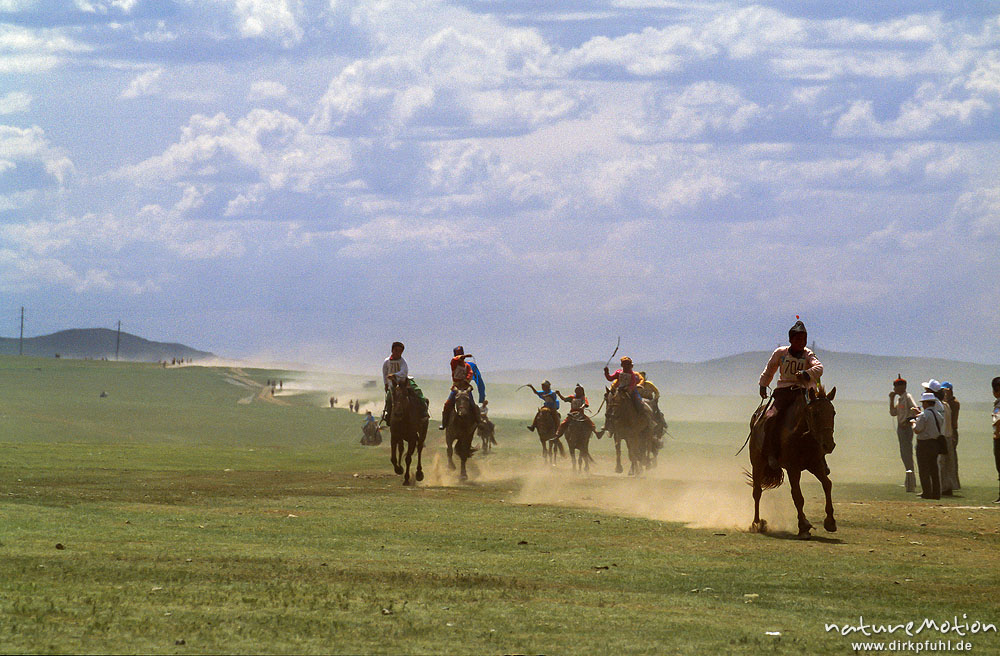 Feld der Reiter kurz vor dem Zieleinlauf beim Pferderennen Ulaanbaatar - Ulan Bator, Mongolei