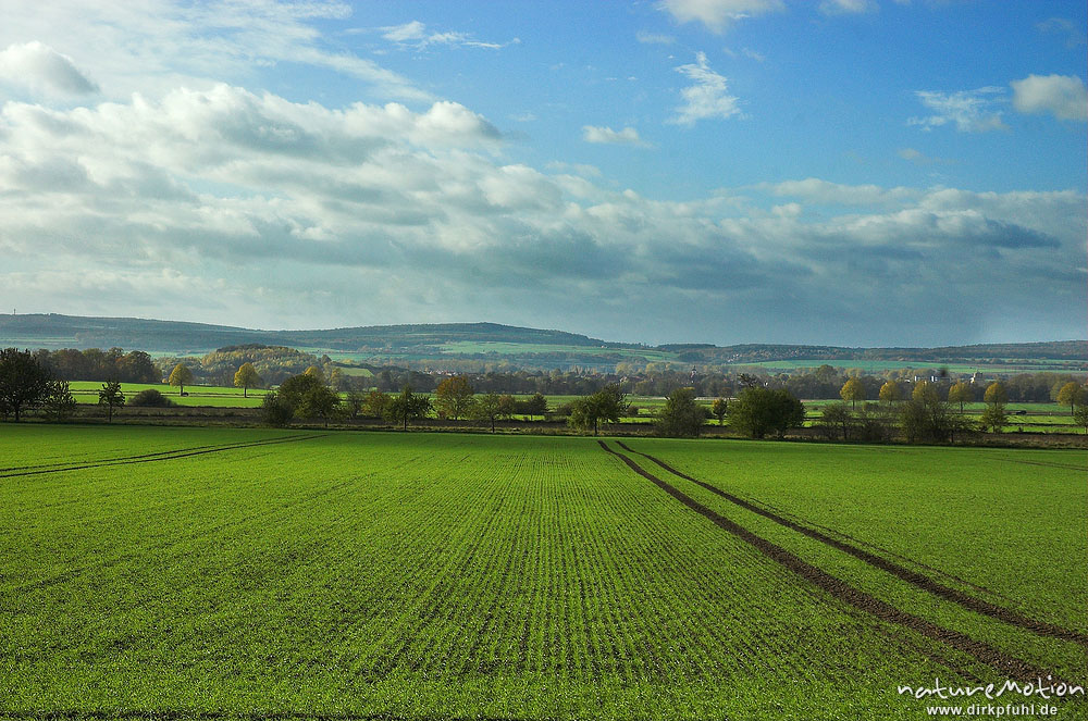 Feld mit Wintergetreide, Herbstbäume, Himmel, Leinetal, Göttingen, Deutschland