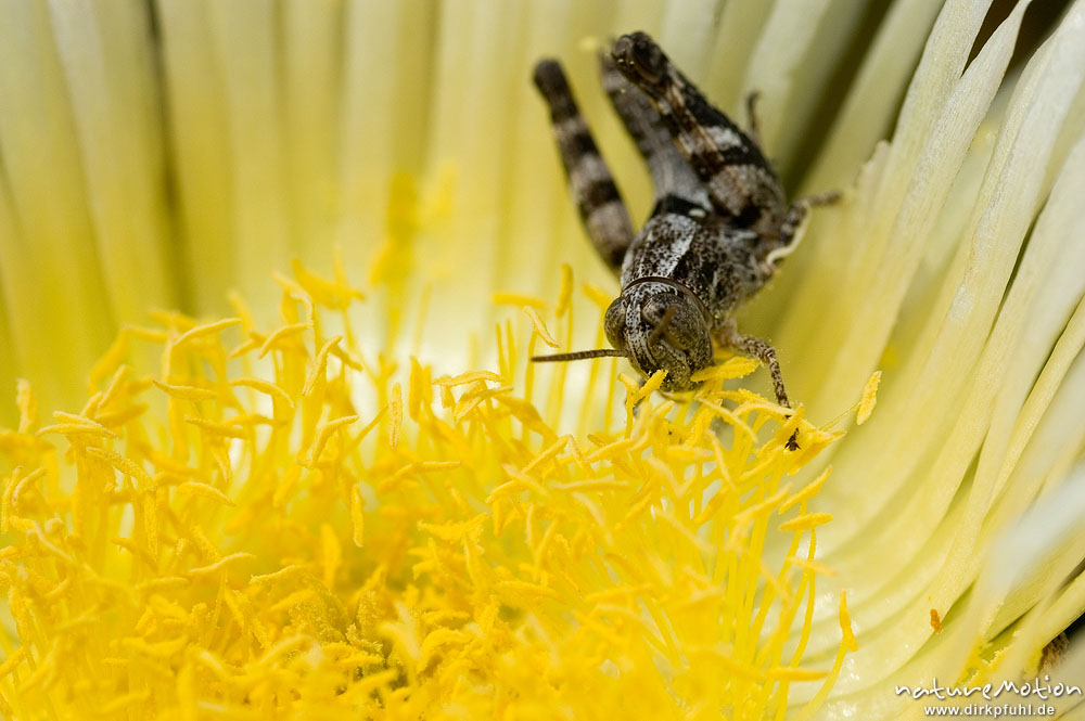 Feldheuschrecke frisst an Blütenblättern und Staubblättern einer Küstenmittagsblume, Carpobrotus edu, Korsika, Frankreich