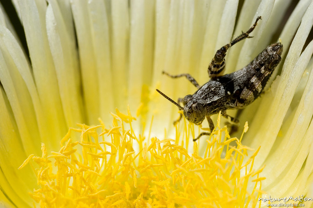 Feldheuschrecke frisst an Blütenblättern und Staubblättern einer Küstenmittagsblume, Carpobrotus edulis, Aizoaceae, Stand bei Palombaggia, Korsika, Frankreich