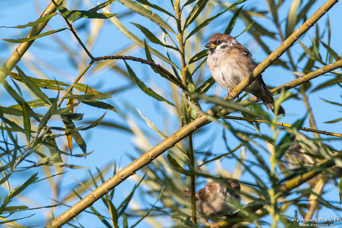 Feldsperling, Feldspatz, Passer montanus, Sperlinge (Passeridae), Gruppe von Tieren rastet in einer Weide, Kiessee, Göttingen, Deutschland