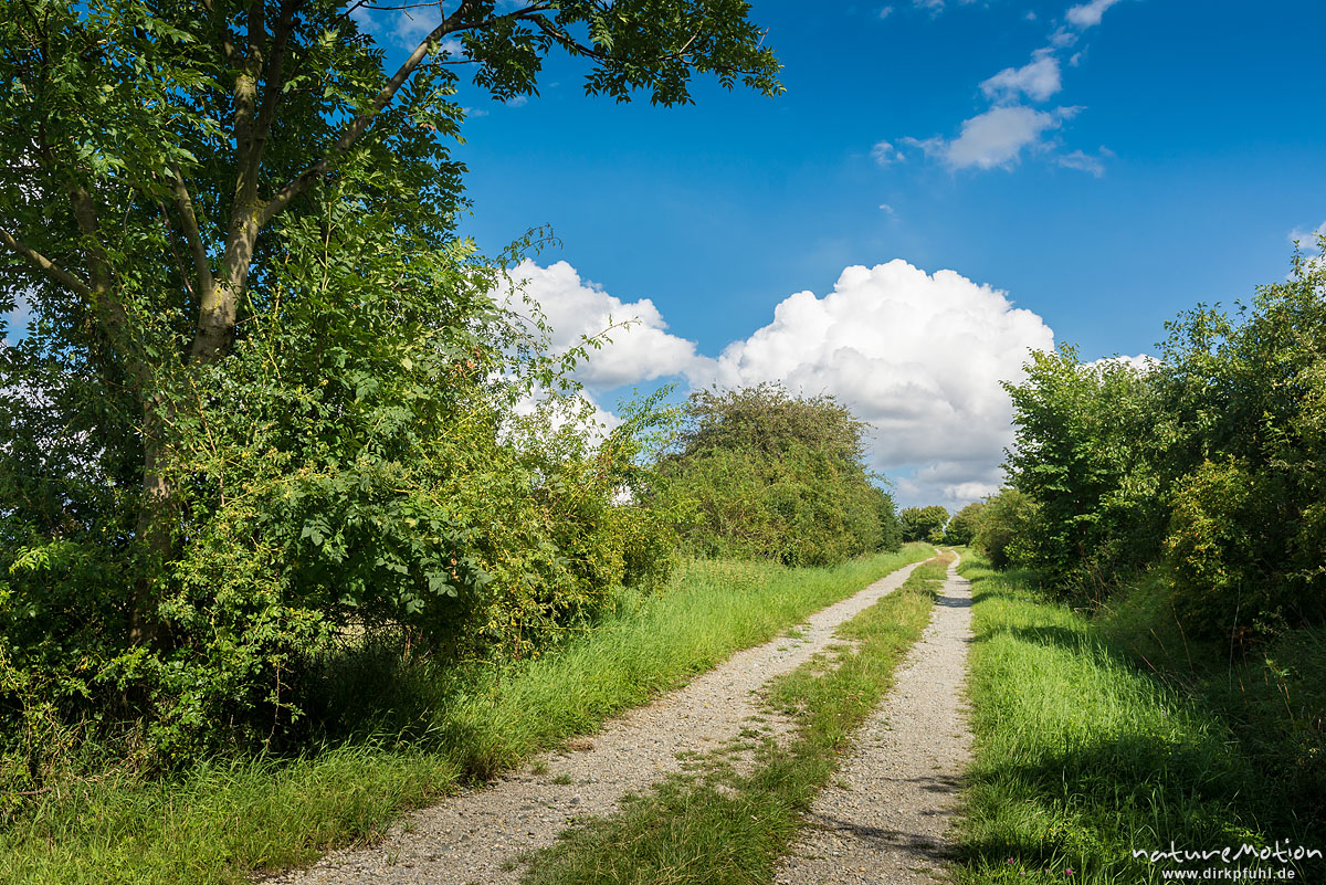 Feldweg gesäumt von Gehölzen, Sommerhimmel, Leineauen, Göttingen, Deutschland